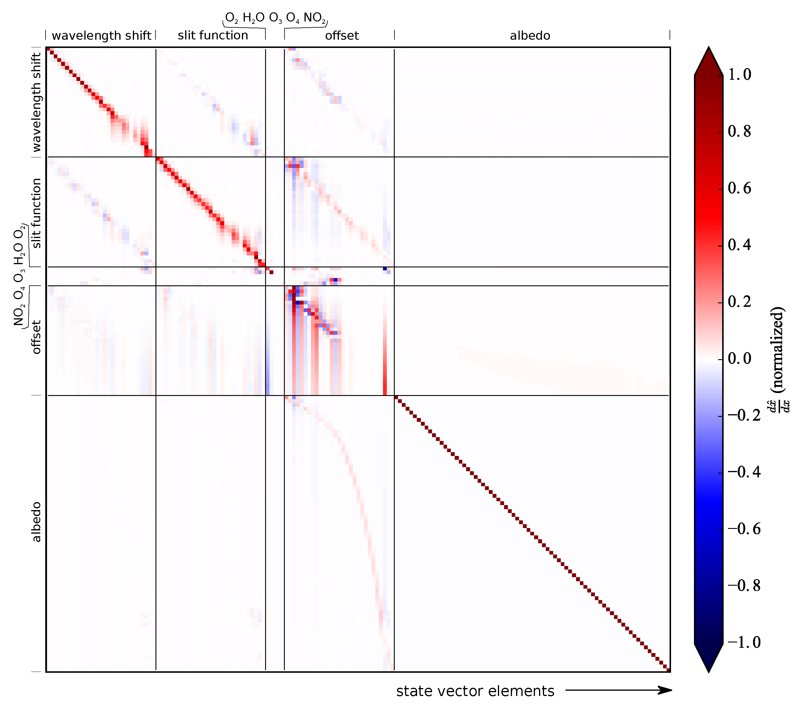Figure 6. Normalized averaging kernel matrix A calculated about the a priori state vector with σ ε of 0.5 mW·nm - 1 ·m - 2 ·sr - 1 . The matrix elements were normalized using the a priori standard deviations to cancel units. The horizontal and vertical lines separate the control points of the different splines.