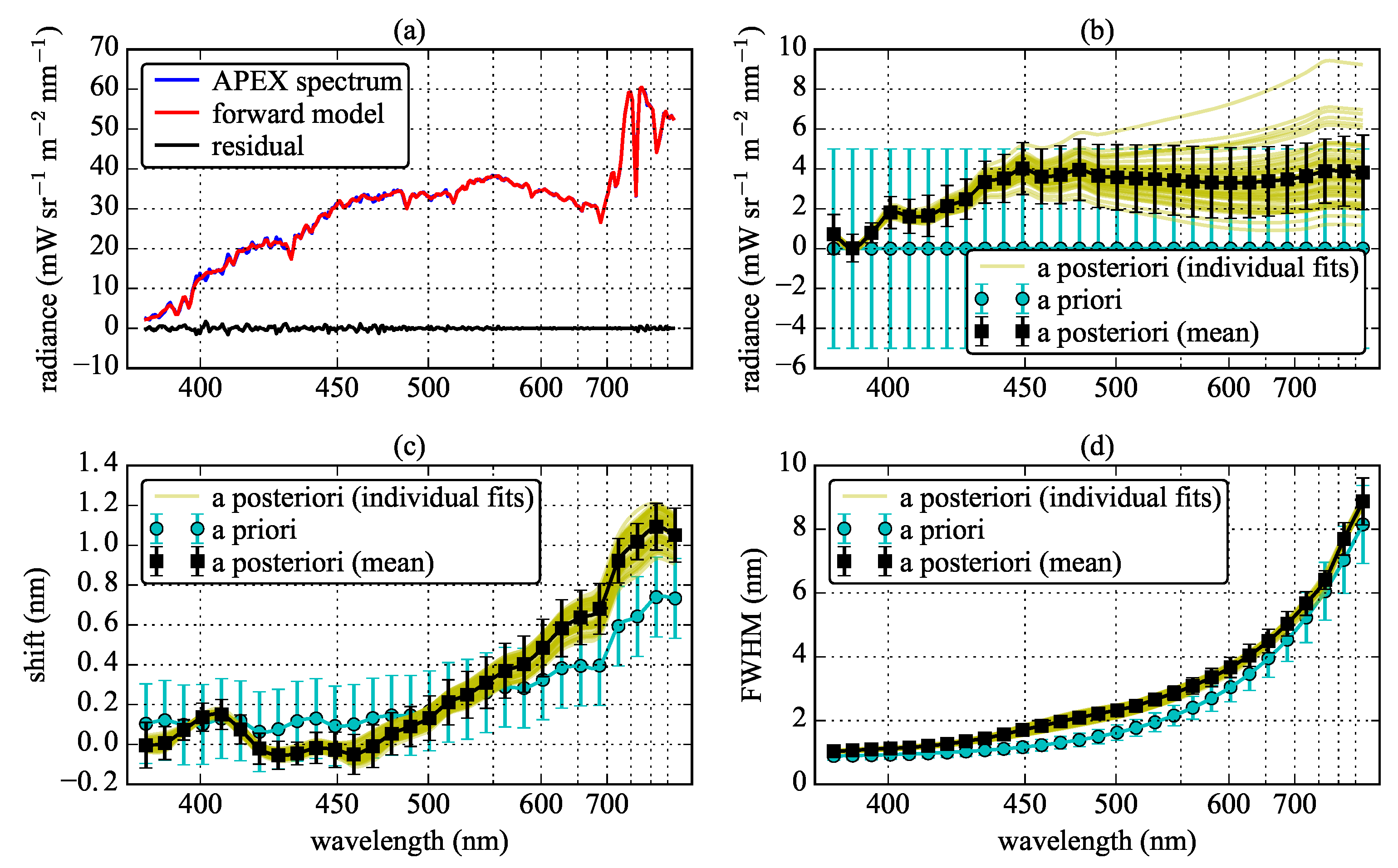 Figure 8. Example of APEX spectral calibration results for fifty spectra in Line 10. (a) Mean measured spectrum and forward model mean and average residual; (bd) a priori and a posteriori radiance offset, wavelength shift, FWHM.