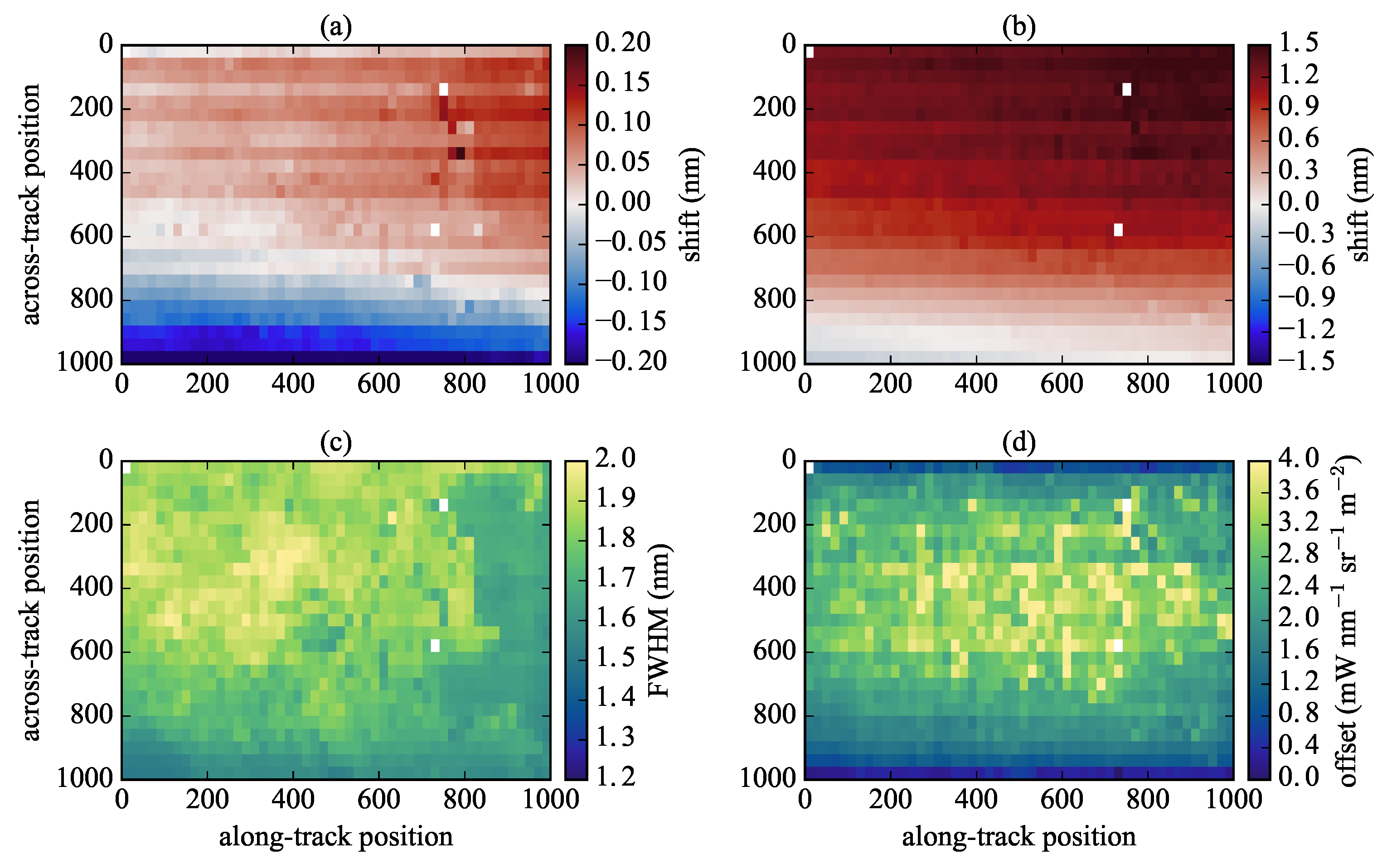 Figure 9. Across- and along-track changes of APEX spectral calibration for the test cube sampled over Zurich. The maps show wavelength shifts in: (a) the visible (410–520 nm); and (b) the near infrared (720–815 nm); (c) shows the FWHM in the along- and across-track direction; and (d) radiance offset for 410–520 nm.