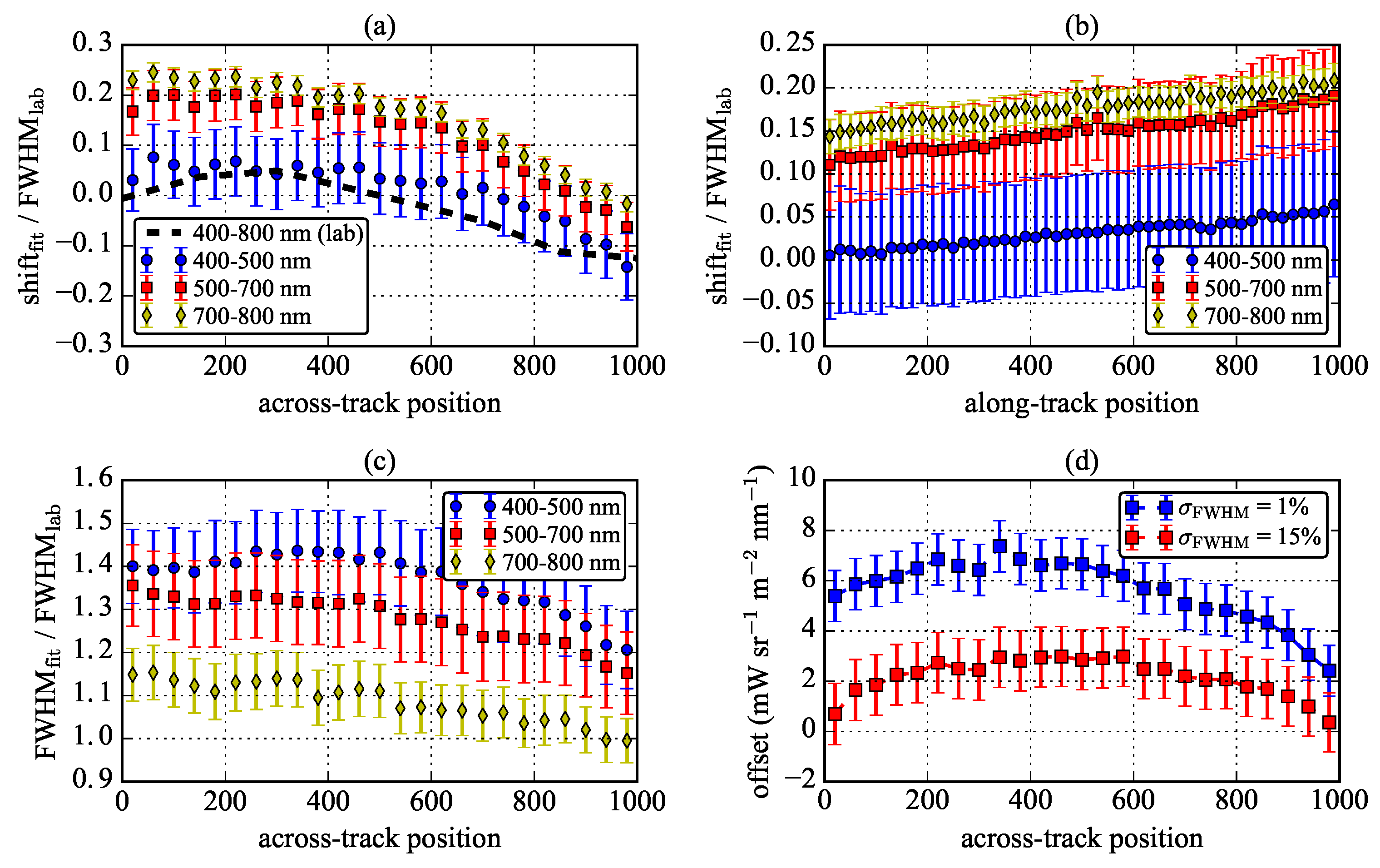 Figure 10. Results from APEX spectral calibration. (a) Across- and (b) along-track wavelength shifts for different wavelength bands. (c) FWHM in across-track direction; (d) across track profile of radiance offset (400–500 nm) with two different a priori standard deviations for FWHM.