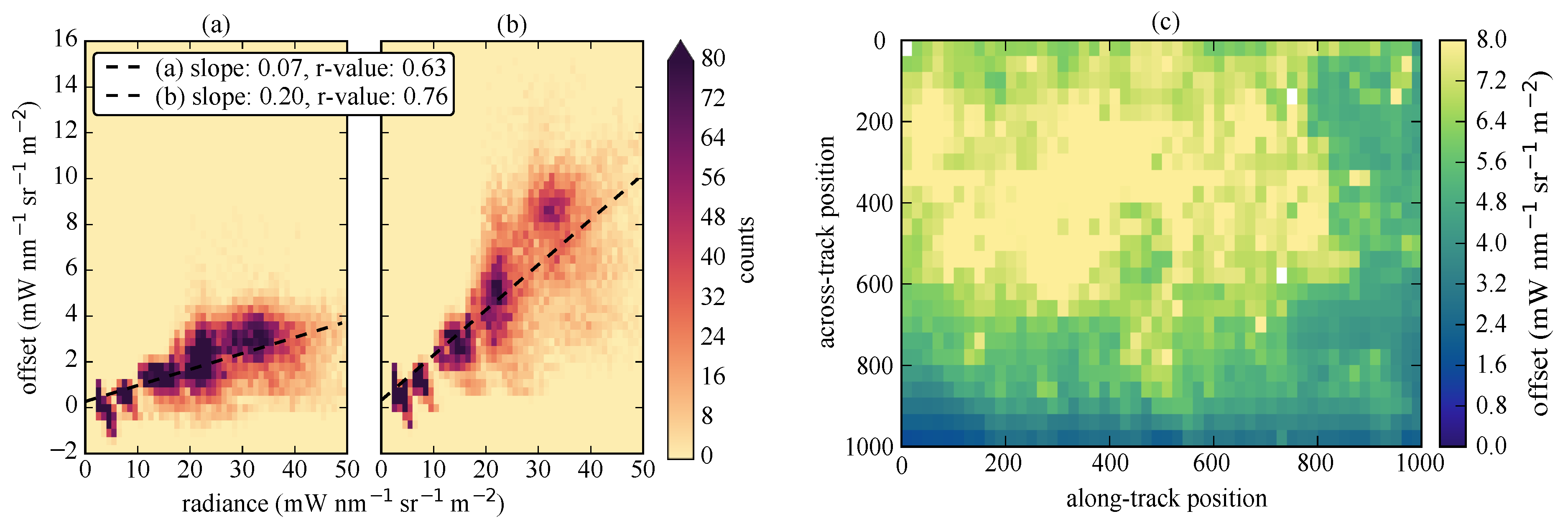 Figure 11. Scatter plot of retrieved radiance offset against measured radiance (a) with an a priori standard deviation of 15% FWHM lab and (b) 1% FWHM lab ; (c) map of the radiance offset (410–520 nm) with 1% FWHM lab .