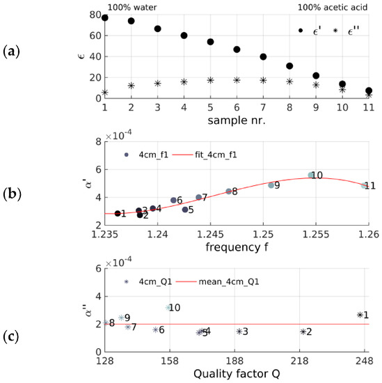 (a) Filling factor α calibration using mixtures spanning the range from 100% water (sample 1) to 100% acetic acid (sample 11): Permittivity real and imaginary part ε′/ε″ computed for slim glass tubes filled with water-acetic acid sample inserted into cavity at full lenght; (b) resonant frequency f and (c) Quality factor Q plotted against α’/α″ values derived for each water-acetic acid mixture and the 4 cm tube depths including the 3rd order polynomial fit/mean value, respectively.