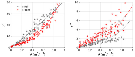 Estimated permittivities, (a) real ε′ and (b) imaginary ε″ part, of all organic samples measured over the entire wetness range θ and at room temperature (filtered as specified in Section 2.2.3), using a filling factor α for the full tube length (grey) and specifically calibrated for the 4 cm tube insertion depth (red).