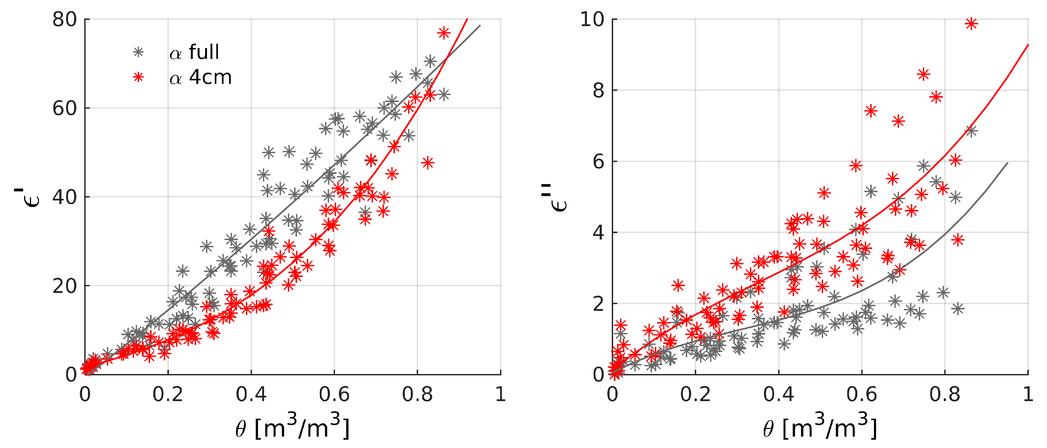 Figure 3 shows all average resonant cavity permittivity estimates (real and imaginary parts in left and right panel, respectively) of samples from organic horizons at room temperature for the entire wetness range and filtered as specified in Section 2.2.3, in grey when using an alpha filling factor for the full tube length and in red specifically calibrated for the 4 cm tube insertion depth.