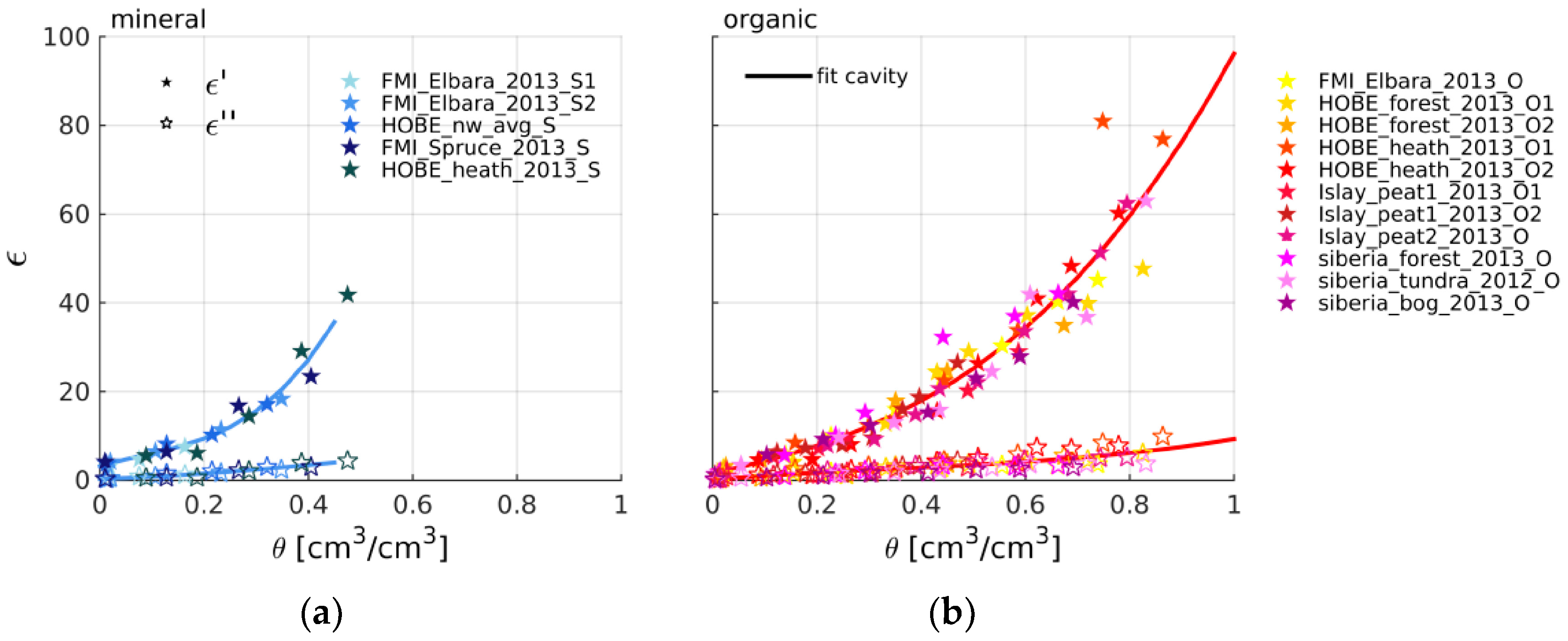 Average resonant cavity relative permittivity ε measurements (filled and empty stars for real ε′ and imaginary ε″ part, respectively) over the entire wetness range θ, at room temperature, for the (a) individual mineral and (b) organic samples. Simple empirical models fit through the cavity datasets of all organic and mineral samples (for ε′ and ε″, respectively) are plotted along (solid line).