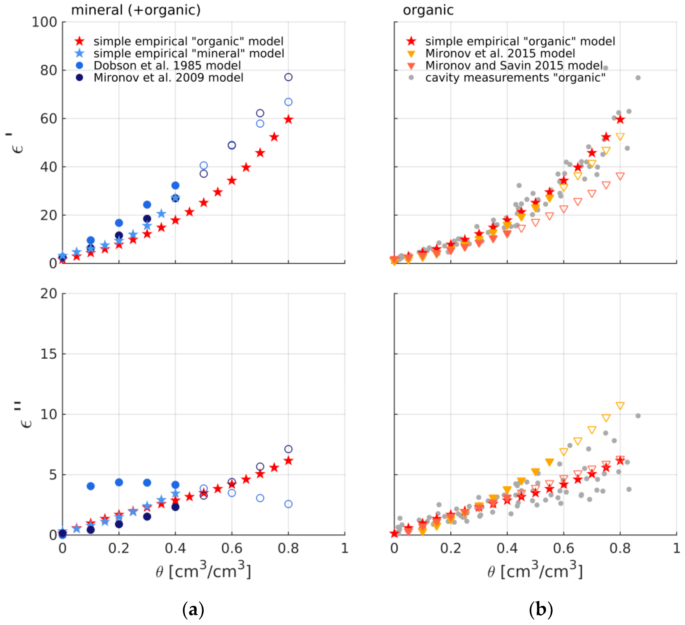 Measured and modeled relative permittivity data as a function of soil moisture at room temperature, real ε′ (top panel) and imaginary ε″ (bottom panel) parts. (a) Simple empirical models based on 3rd order polynomial fits through the collectivity of sandy mineral as well as organic samples (light blue and red stars, respectively), Dobson and Mironov mineral model outputs (blue and dark blue circles, respectively) using input specificed in Table 2; (b) resonant cavity measurements acquired from all organic samples after filtering (grey dots) including the empirical model for organic substrates (red stars), now together with curves fit through output of the Mironov et al. [30] and Mironov and Savin [31] models for organic soil layers (orange and salmon triangles, respectively) adopted from literature. Filled icons denote the range where data was available for (a) model calibration of the Dobson and Mironov mineral models or (b) for curve fitting to the data presented in Mironov et al. [30] and Mironov and Savin [31].