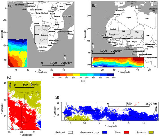 The importance of rainfall amount and variability for vegetation response was assessed in two major African dryland regions, namely South West Africa (SWA) and West Africa (WA) (Figure 1a,b). The MAP gradients in these regions range from approximately 20 mm to >900 mm. However, only regions with MAP <900 mm were considered as above this threshold rainfall increasingly loses its predetermining influence on vegetation [15,38]. The SWA study region (Figure 1a) is characterized by a southern-centric summer rainy season which lasts approximately from November to April with the south-western parts experiencing significantly shorter seasons compared to the north-east. Vast areas of this region are covered by shrub and savanna vegetation and only minor parts are characterized by grassland (Figure 1c). The WA study region (Figure 1b) is characterized by a Northern hemisphere summer precipitation regime receiving nearly all annual rainfall during the rainy period between July and October. Large parts of this region are characterized by grassland or savanna vegetation (Figure 1d). A more detailed description of the study regions can be found in the Appendix A.