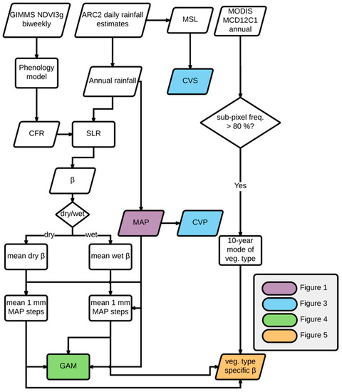 Flowchart of the data processing and analysis. MSL refers to mean season length, CVS is the coefficient of variation of season length, MAP represents mean annual precipitation, CFR refers to cyclic fraction, SLR abbreviates shifting linear regression models, β represents vegetation functional response to rainfall, dry/wet refer to below and above average rainfall conditions, respectively, GAM represents generalized additive models. The colouring scheme refers to the figure in which the respective analysis step is presented.