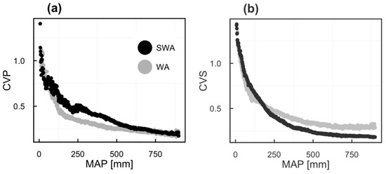 Arguably, response curves (Figure 4a,b) are modified by the local vegetation composition with its distinct sensitivity to rainfall. However, MAP is a first order determinant of vegetation composition in arid and semi-arid regions [57] and thus implicitly accounts for the vegetation-specific response to rainfall. Hence, the differences of vegetation-specific β between regions must be a result of physiological and structural adaptions to differing environmental heterogeneity rather than being caused by different positions on the MAP gradient. This conclusion is further supported by the fact that all vegetation types are found in approximately the same regions of MAP in both regions (Figure 6). The distribution of the major vegetation types, however, indicates differences in the relative abundance between regions (Figure 6). While WA is rather dominated by grass/crop type vegetation, SWA is strongly dominated by savanna and shrub type vegetation. Thus, rainfall variability may have an indirect effect on vegetation composition with higher CVP promoting shrub type vegetation whereas lower CVP favours grass type vegetation [69].