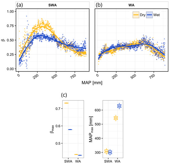 βmax is significantly higher in SWA than in WA (Figure 4c). It moreover significantly differs between wet and dry episodes in SWA which does not apply for WA. Both can be expected from the overall higher β in SWA (Figure 4a). It thus further supports the hypothesis that greater rainfall variability (CVP, Figure 3a) may lead to a temporally more dynamic vegetation response to rainfall [37,67]. MAPβ-max values (the positions of βmax on the rainfall gradients) are significantly lower in SWA compared to WA (Figure 4c). This indicates that the transition zone from rather physiological limitations to more edaphic constraints on β [3] is highly variable between regions.