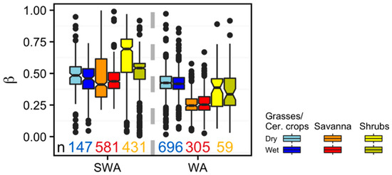 The vegetation-specific response to rainfall (Figure 5) indicates that grass type vegetation shows no significant difference between dry and wet periods irrespective of study region. Moreover, grass/crop β is consistently lower in WA compared to SWA although this difference is small. In West Africa, grass/crop type vegetation has the overall highest β of all vegetation types.