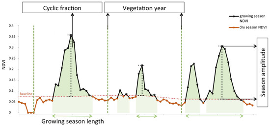 The algorithm of the phenological model [46] used in this study is designed to handle vegetation index data in a bi-weekly temporal resolution. In a first step, it ingests a set of 3 years of data with the year of interest being the centermost. This window is subsequently shifted along the temporal axis as soon as per time step all processing steps have been accomplished. Therefore, the following descriptions are generic and applicable to any given time step. In order to avoid false alarms for the calculation of the start of season, negative outliers are linearly interpolated; considered a negative outlier is a value with a difference of 5% to the preceding and following bi-weekly value relative to the value calculated as max−min of the respective two-year period. The start of the season (SOS) is found by means of an ancillary variable derived as moving sum of the differences between each value of the time series and its predecessor. The moving sum is built over each six consecutive differences, and can be understood as the average change over time during each 3-month window. In cases where no SOS can be found the average SOS of the other years is taken. SOS in general refers to the start of the so called “vegetation year”. A vegetation year is composed of commonly one (or two and more in regions with several rainy seasons) vegetation peak(s) (cyclic fraction, CFR) followed by the dry season(s) (see Figure B1). To determine the onset and the end of the CFR of any given year, a baseline is derived, which separates the dry season values from the CFR. Values above this baseline are part of the CFR, values below belong to the dry season. The baseline is derived from the average amplitude between the dry season values and the preceding and respectively subsequent vegetation peak. The CFR is consequently determined as sum of the distances of all time-series values above the baseline to the latter. Thus, the CFR constitutes the integral of the vegetation season values above the (local) “dry season greenness” level expressed by the baseline.
