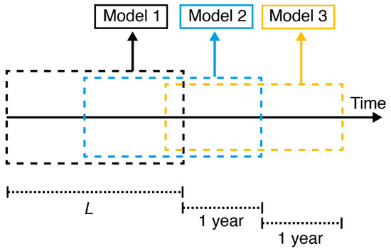 The principle of the SLR is depicted by Figure C1. The first model in the time series in this schematic is Model 1 ingesting data from year 1 to year L. The model is subsequently shifted by one year and becomes Model 2 etc. Per model, the linear slope coefficient (β) is extracted. Slope coefficients are found based on ordinary least squares (OLS) techniques. The procedure is similar to moving correlation functions [79]. However, the SLR derives quantitative slopes rather than correlation coefficients (r-values).