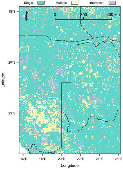 Maps of the South West African (SWA) study region of the mode of the shifting linear regression model (SLR) with the lowest AIC. “Single” = model with only rainfall of concurrent year as explanatory variable, “Multiple” = model with rainfall of concurrent year and previous year as additive variables and “Interactive” = model with an added interaction term of the “Multiple” model.