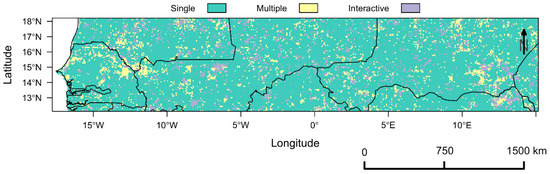 Maps of the West African (WA) study region of the mode of the shifting linear regression model (SLR) with the lowest AIC. “Single” = model with only rainfall of concurrent year as explanatory variable, “Multiple” = model with rainfall of concurrent year and previous year as additive variables and “Interactive” = model with an added interaction term of the “Multiple” model.