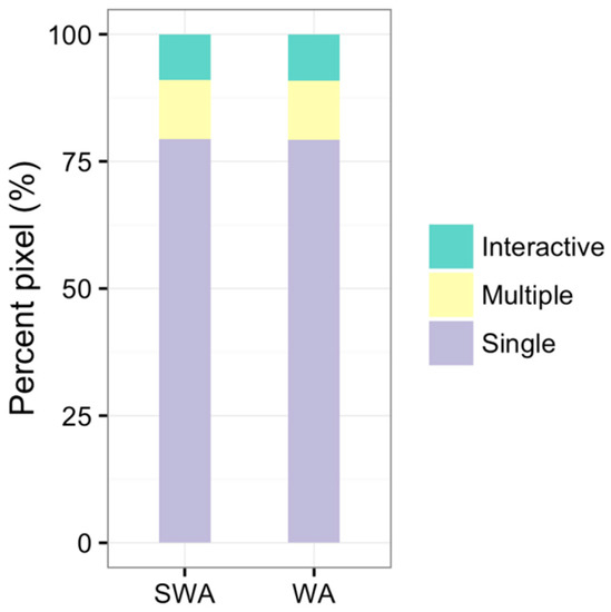 Percent pixel with the mode of the lowest Akaike’s Information Criterion (AIC) as a function of study region (South West Africa, SWA, and West Africa, WA). “Single” = model with only rainfall of concurrent year as explanatory variable, “Multiple” = model with rainfall of concurrent year and previous year as additive variables and “Interactive” = model with an added interaction term of the “Multiple” model.