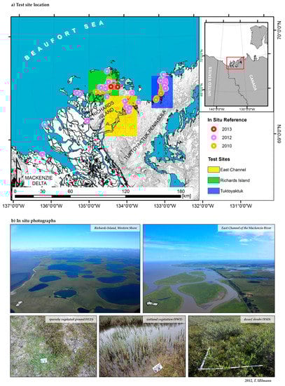 Additionally, in situ ground truth data on the land cover were recorded in the summers of the years 2010, 2012, and 2013. The location of the investigated sites is drawn in Figure 1. In 2010 the field work was conducted by the NWRC (National Wildlife Research Centre, Ottawa, ON, Canada). The field work in 2012 and 2013 was conducted by the Carleton University Ottawa, the NWRC, and the University of Wuerzburg. More than forty locations inside the region were visited and surface properties were documented. The number of reference samples was increased afterwards using high resolution aerial ortho-photos provided by Hartmann and Sachs [] and NWT-Geomatics []. After this operation the set of land cover reference data comprised more than 1700 individual polygons and a minimum of 200 polygons per land cover class. A set of 1000 points per class was then chosen randomly for each test site.