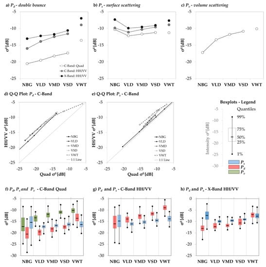 Median sigma nought (σ°) backscatter intensities in decibel (dB) of: (a) double bounce (Pd), (b) surface scattering (Ps) and (c) volume scattering (Pv) for none-water land cover classes (NBG, VLD, VMD, VSD, VWT) and for C-Band Radarsat-2 and X-Band TerraSAR-X data. The power decomposition features of “C-Band: HH/VV” and “X-Band: HH/VV” were derived via the purposed two component decomposition. Features of “C-Band: Quad” were calculated using the three component Yamaguchi Decomposition. Schemes (d) and (e) show the quantile-quantile plots of the two and three component decomposition features double bounce (Pd) and surface scattering (Ps) for the quantiles 1%, 25%, 50%, 75%, and 99%. The boxplots show the decomposition features of: (f) C-Band: Quad; (g) C-Band: HH/VV and (h) X-Band: HH/VV. Note that NBG, VLD, VMD, and VSD are in an ordinal scale and vegetation height and density is increasing from NBG to VSD.