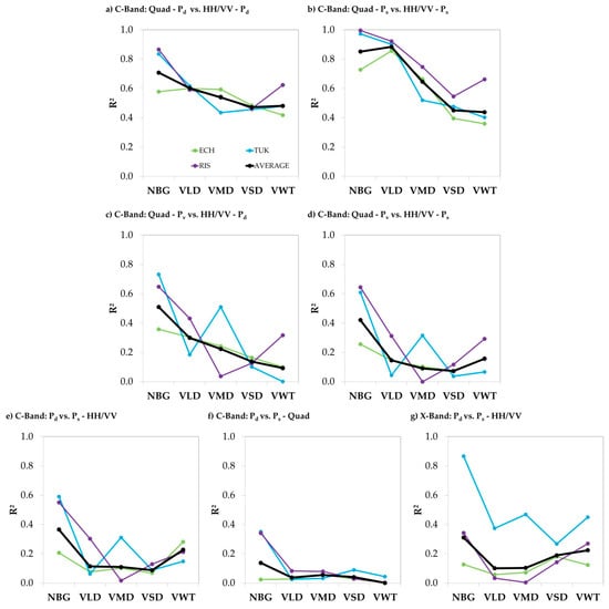 Squared linear Pearson correlation coefficients (R2) for none-water land cover classes (NBG, VLD, VMD, VSD, VWT) of: (a) double bounce (Pd) of the two and three component decomposition; (b) surface scattering (Ps) of the two and three component decomposition; (c) volume scattering (Pv) of three and Pd of the two component decomposition (C-Band); (d) Pv of three and Ps of the two component decomposition (C-Band); (e) Pd and Ps of the two component decomposition (C-Band); (f) Pd and Ps of the three component decomposition (C-Band) and (g) Pd and Ps of the two component decomposition (X-Band). Abbreviations of the test sites: TUK: Tuktoyaktuk, RIS: Richards Island, ECH: East Channel of the Mackenzie River.