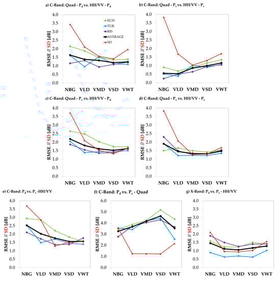Root Mean Square Error (RMSE) of the linear models and the product of standard deviations of the two variables (SD) for none-water land cover classes (NBG, VLD, VMD, VSD, VWT) for: (a) double bounce (Pd) of the two and three component decomposition; (b) surface scattering (Ps) of the two and three component decomposition; (c) volume scattering (Pv) of three and Pd of the two component decomposition (C-Band); (d) Pv of three and Ps of the two component decomposition (C-Band); (e) Pd and Ps of the two component decomposition (C-Band); (f) Pd and Ps of the three component decomposition (C-Band) and (g) Pd and Ps of the two component decomposition (X-Band). Note the different value range of the ordinate in sub-figure (f). Abbreviations of the test sites: TUK: Tuktoyaktuk, RIS: Richards Island, ECH: East Channel of the Mackenzie River.