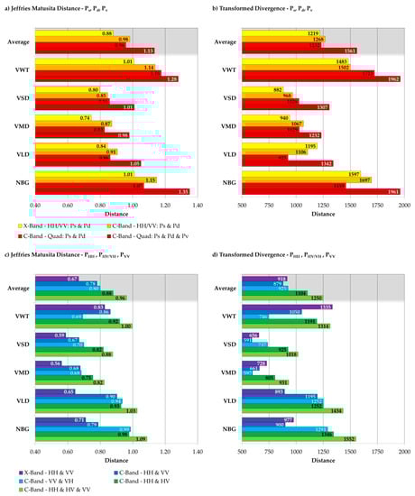 The separability features Jeffries Matusita Distance (JD) and Transformed Divergence (TD) [,] were further investigated to examine the differences between C- and X-Band, between the two and three component decomposition features and to examine if PolSAR decomposition offers better class separation compared to the “pure” intensities of the polarimetric channels. The values of the dimensionless JD range from 0.0 to . The values of the dimensionless Transformed Divergence range usually from 0 to 2000. The higher the value of a separability feature the higher is the estimated separation of the classes in the feature space and the expected classification accuracy. JD and TD require that the values of the classes are normally distributed. This is usually not the case; however a common assumption for natural targets and media for simplicity reasons. JD and TD then estimate the overlap between the multivariate normal distributions of two classes of interest in a given feature space. Less (more) overlap indicates better (worse) separability and therefore the classification accuracy is expected to be higher (lower).