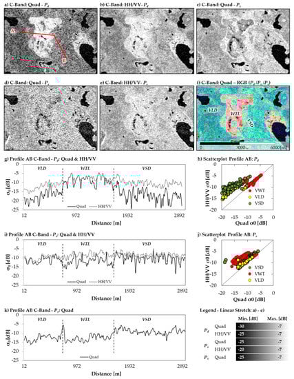 Profile analysis of C-Band Radarsat-2 data of the test site Tuktoyaktuk (TUK): (a–e) images of the two and three component decomposition features double bounce (Pd), surface scattering (Ps) and volume scattering (Pv); (f) RGB colour composite of three component decomposition; (g) profile values of Pd (two and three component decomposition); (h) scatterplot of Pd of two and three component decomposition; (i) profile values of Ps (two and three component decomposition); (j) scatterplot of Ps of two and three component decomposition and (k) profile values of Pv of the three component decomposition. The abbreviations “VLD”, “VWT”, and “VSD” refer to the dominating land cover units: low/sparse vegetated tundra, wetland and shrub dominated tundra.