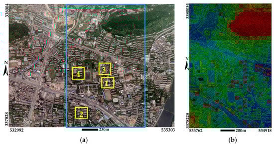 The test area and data source: (a) mosaicked image from the four UltraCamXp images where the cyan solid rectangle corresponding to the test area; and (b) new LiDAR point clouds.