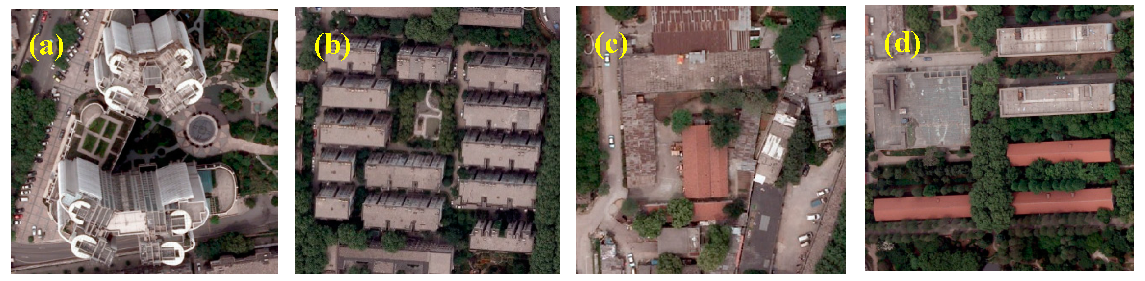 - The buildings with complex structures of roofs or covered by vegetation are removed by the proposed method, which is the main cause of omissions (Figure 12).