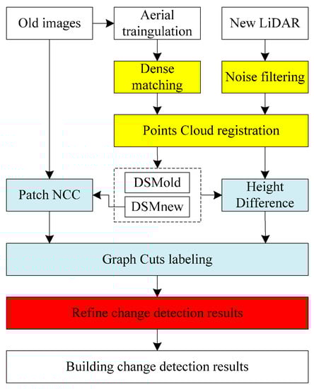 Given multiple aerial images and new LiDAR data, the proposed method begins with a co-registration process, which includes three steps. The first step is to orient all available aerial images and obtain dense photogrammetric point clouds using Pix4D. The second step is to remove possible noise in LiDAR data to improve the quality of LiDAR point clouds based on statistical analysis filtering. The third step is to align the photogrammetric point clouds to LiDAR point clouds using a modified ICP (Iterative Closest Point) algorithm [47,48,49]. After that, robust height difference based on a vicinity window [7] will be calculated from the interpolated DSMs. Meanwhile, grey-scale similarity will be computed as another change indicator. Based on these two change indicators, the graph cuts algorithm will be adopted to determine the raw change map. Finally, two different post-processing methods are applied to refine the raw change map. For the positive changes, a novel method based on the variance of normal direction of LiDAR points is proposed to remove the vegetated areas. Meanwhile, nEGI based on color information is used for refining the negative changes. The framework of the method is illustrated in Figure 3.