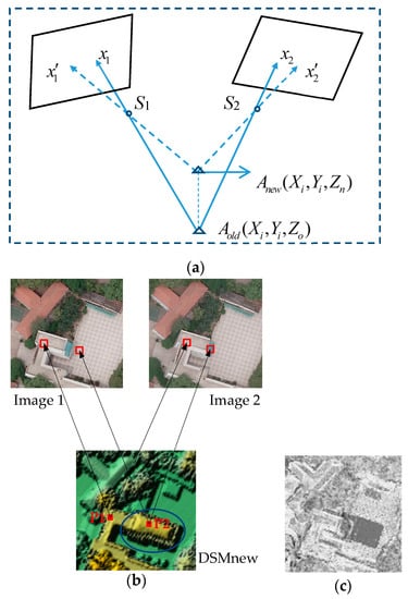 As the used photogrammetric point clouds are derived from image pairs, if we back-project a 3D photogrammetric point to the stereo image pair, it will appear as a correspondence in image space. After co-registering photogrammetric and LiDAR point clouds, the back-projected LiDAR points to the stereo image pair will also appear as a correspondence, if there is none height change. However, if there is a height change, it will no longer be a correct correspondence. As shown in Figure 4a, projecting the point in DSMold to corresponding images will get a match () in image space. If we calculate the Normalized Cross-Correlation (NCC) in a neighborhood taking the match as center, this NCC value will tend to 1. If there is no height change for in DSMnew, i.e., equal to , we project to both images will get the same match (). As shown in Figure 4a, if there is height change for , the back-projection image points () could no longer be a correct corresponding point because height change occurs in this position. In such case, as X and Y coordinate is same, difference in Z value will lead to a smaller NCC values calculated from the pixels around (). However, if close to , NCC values will also be higher. As illustrated in Figure 4b, object has no height change so it gets correspondence in image space. On the contrary, object does not get correct correspondence due to height change. Thus, this observation is used as another indicator to infer changes [44]. We project each grid center of the DSMnew into all the old images to obtain NCC map. The NCC value is computed among each other images and the maximum value is adopted for each grid. Window size for computing NCC is set to 13 × 13. The calculated NCC map is shown in Figure 4c, where it can be seen that the changed building marked in the ellipse in Figure 4b has low NCC value.