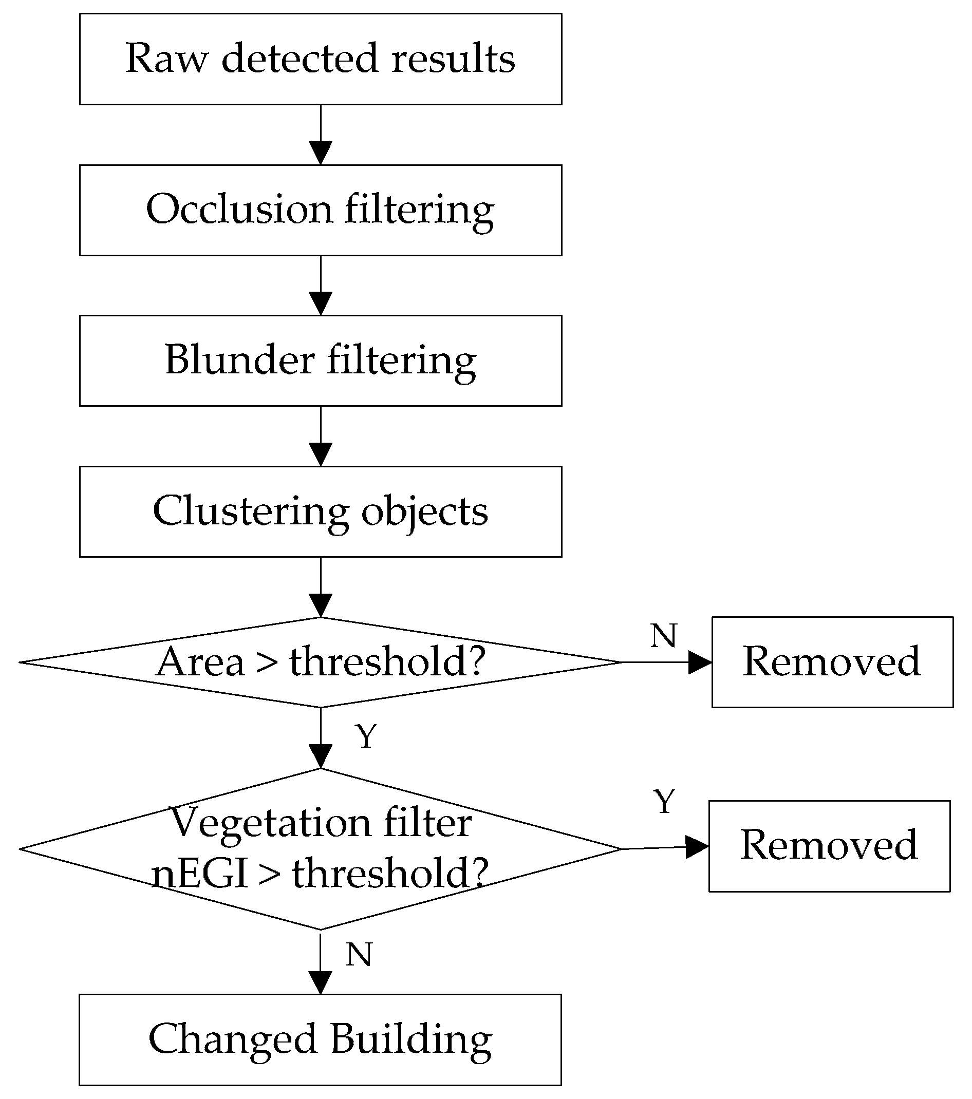 To refine the negative building change map, the processes of blunder filtering, and area threshold filtering are used in a similar way as mentioned Section 2.5.1. In addition, a different vegetation filter and an extra occlusion filter are proposed to alleviate false alarms. The workflow of negative building change refinement is shown in Figure 7, and the detailed procedures of occlusion filter and vegetation filter are described in the following paragraphs.