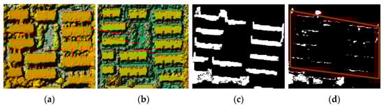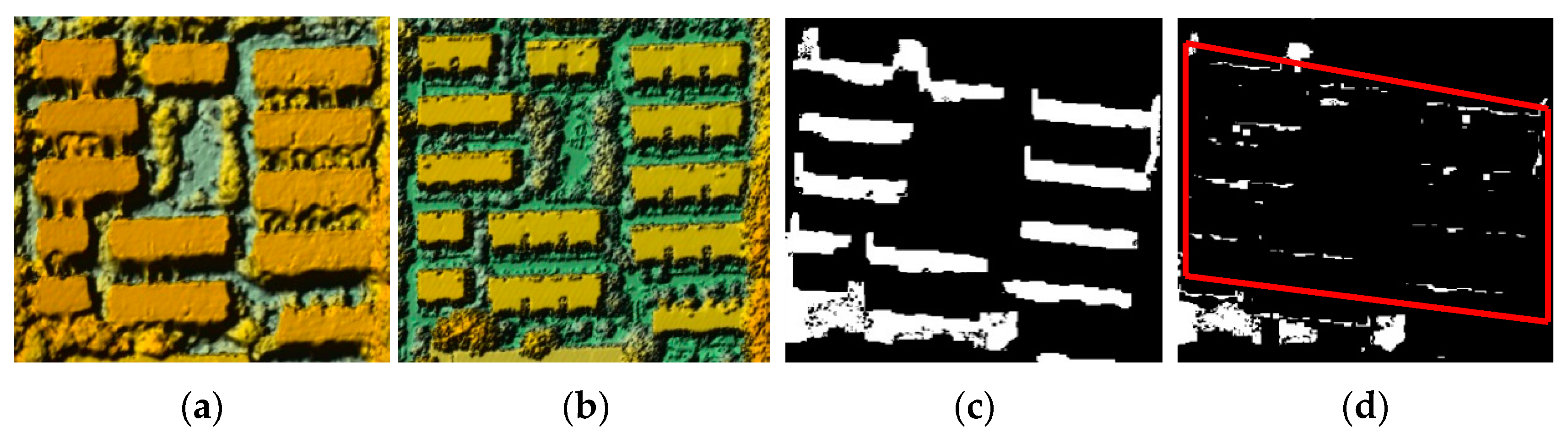 Figure 8 provides an example to illustrate the occlusion filtering processing. Figure 8a,b is a corresponding region in DSMold and DSMnew. It can be seen that the building area in DSMold is larger than the corresponding building in DSMnew. This is because that there are interpolated errors in the occlusion area below the sides of these buildings. This phenomenon does not exist in DSMnew. This situation will lead to the false detection, as shown in Figure 8c. After occlusion filtering, the occlusion areas can be mostly be removed as shown in Figure 8d, the linear-shape bundlers as shown in the red polygon area will be removed by a morphological opening operation.