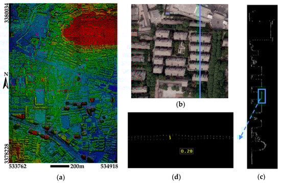 Photogrammetric point clouds and the co-registration result of a local area: (a) the photogrammetric point clouds; (b) a sub area for illustrating the point cloud profile; (c) two profiles from both source of point clouds; and (d) amplified view of cyan rectangle in (c).