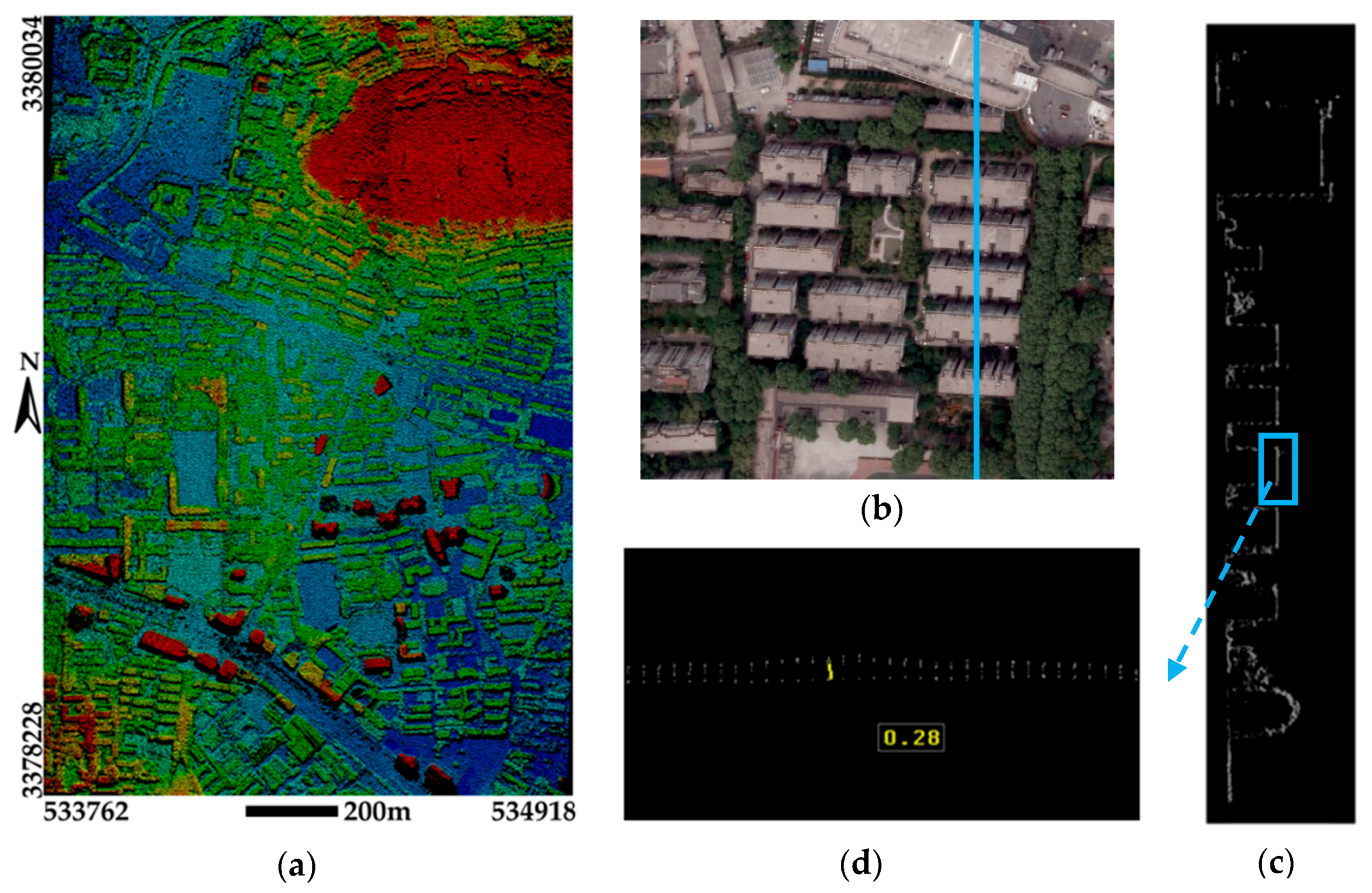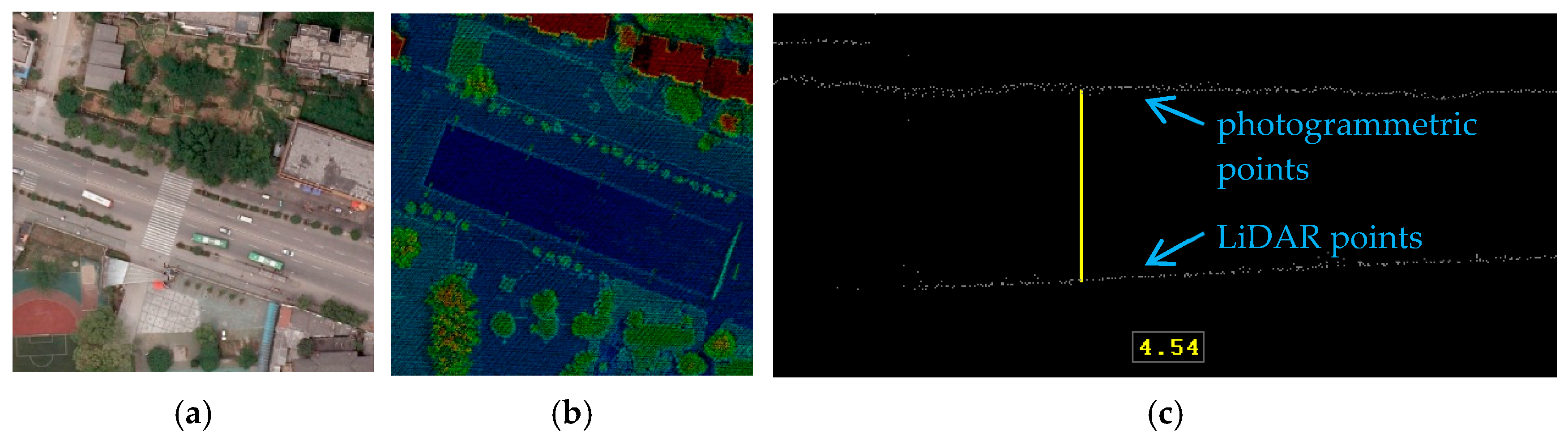 The photogrammetric point clouds generated from the aerial images are shown in Figure 9a and there are several obvious holes in the point clouds especially around the tall buildings. After obtaining the photogrammetric point clouds, a pre-processing step is performed to co-register these two sets of point clouds. The RMSE (Root Mean Square Error) between two point clouds is about 0.2 m. After co-registration, a profile of point clouds in the cyan solid line of Figure 9b from these two sets of point clouds is selected to demonstrate registration accuracy. The profile is shown in Figure 9c and it indicates these two sets of point clouds are well aligned after the registration. To further evaluate the registration result, a part of the selected profile about a building roof is amplified and shown in Figure 9d. The maximal distance between these two profiles is about 0.28 m.