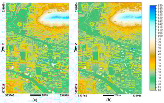 DSM interpolation result: (a) DSMold; and (b) DSMnew.
