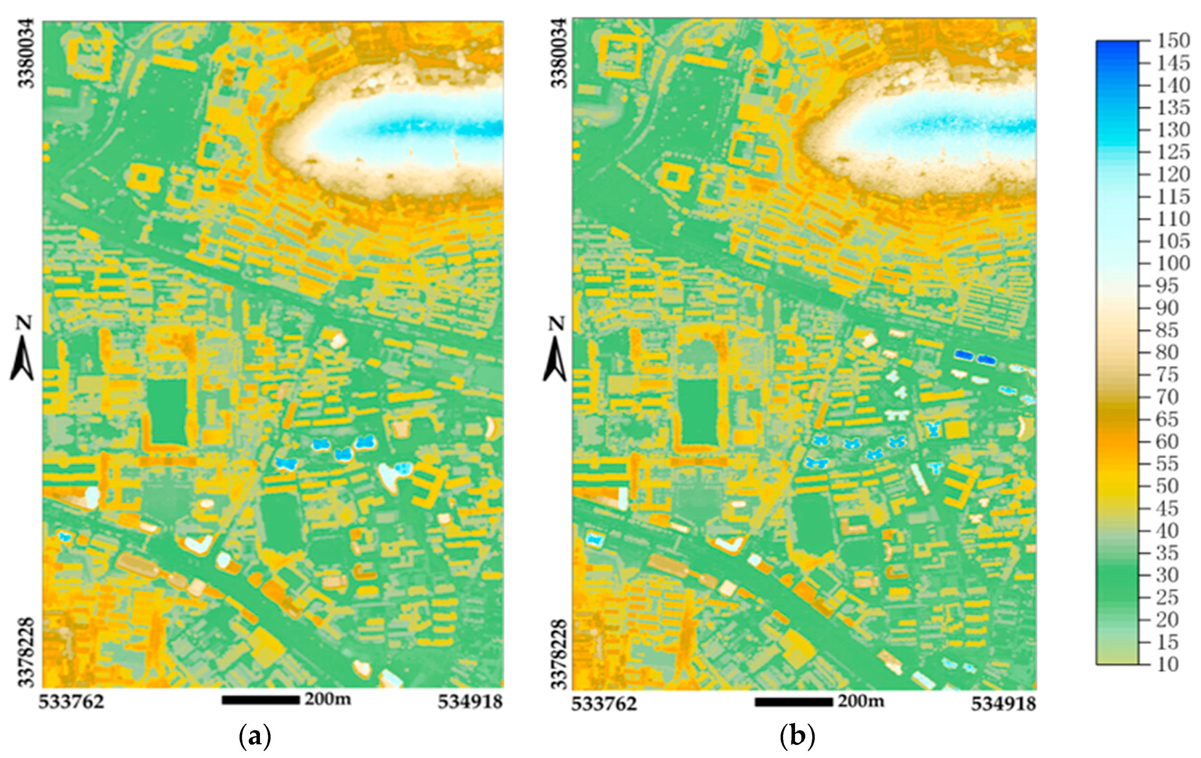 After data co-registration, DSMold and DSMnew are interpolated from photogrammetric points and LiDAR data, respectively, using IDW interpolation method. The interpolated DSM results are in shown as Figure 10.