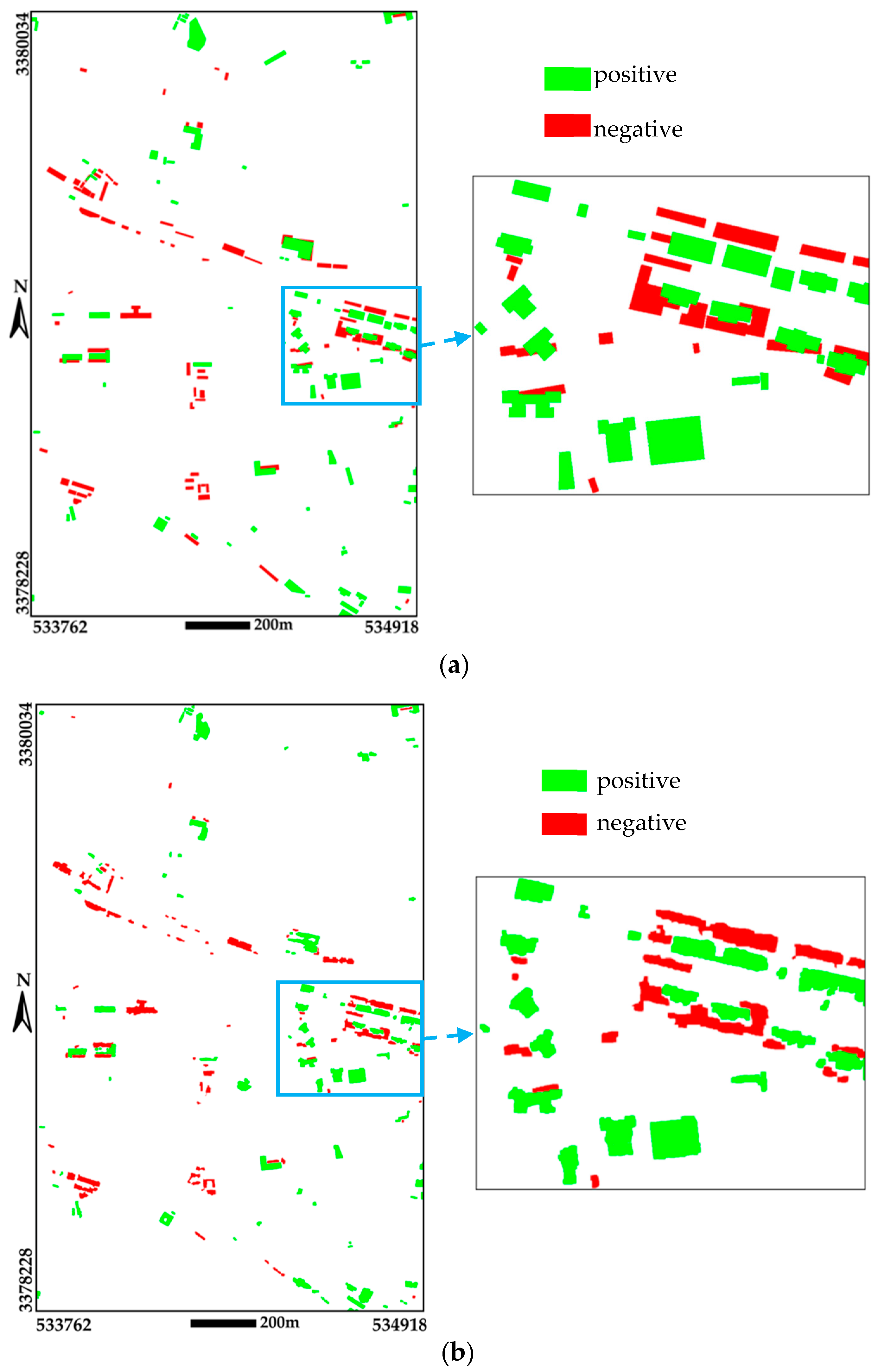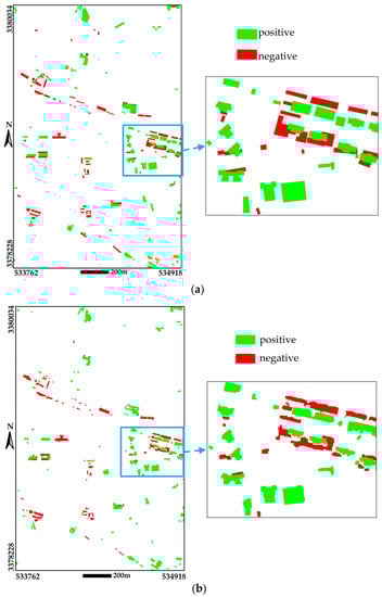To quantitatively evaluate the proposed method, reference data are manually drawn with the assistance of point clouds and aerial images. Building changes are classified into two types: positive change (corresponding to newly buildings or taller buildings) and negative change (corresponding to demolished buildings or lower buildings). There are in total 89 positively changed buildings and 85 negatively changed buildings in the reference data. The details of the building change detection results and reference data are shown in Figure 11, where there are a large number of changed buildings in this area with different and complex shapes.