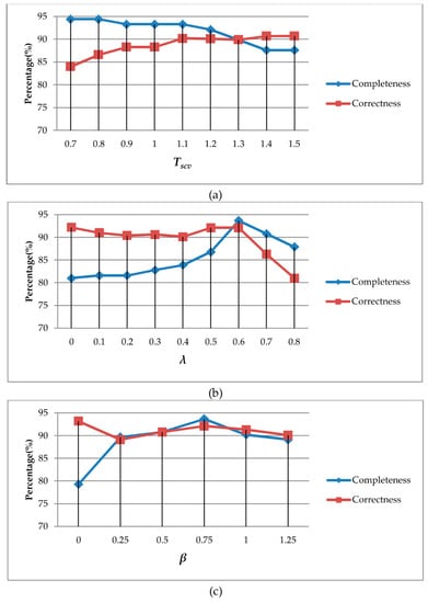 In Figure 14a, when increases, completeness decreases gradually, and correctness increases. This can be explained by part of the changed building object being mistakenly identified as vegetation and removed. According to the comprehensive comparison, obtained the best balance between completeness and correctness. In this research, the number of bins is set to 9, and through our experiment, the bins number can be set 6 to 10 which are all appropriate.