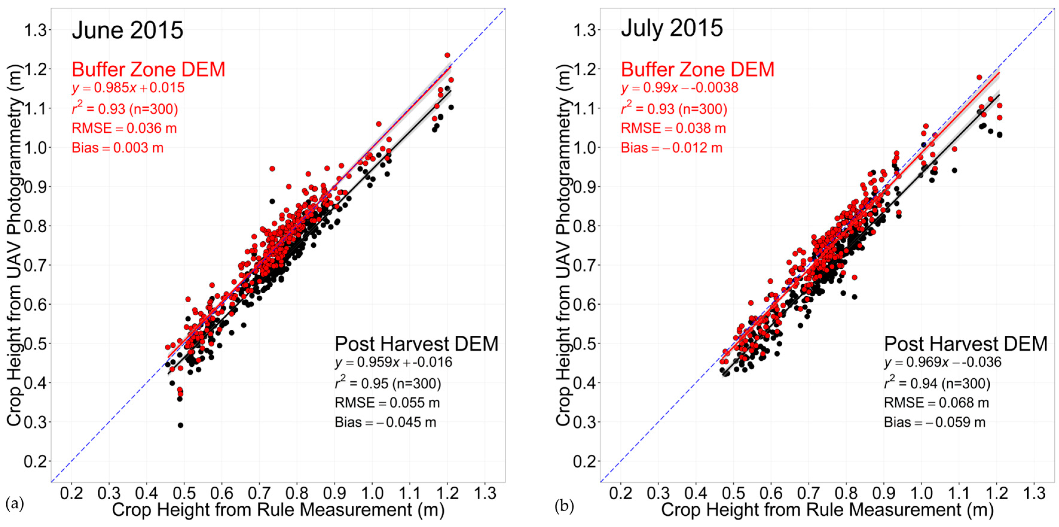 44]. Assessment of model derived crop heights from a highly accurate (5 mm) Terrestrial LiDAR (R2 = 0.97, RMSE = 0.027 m) and the best UAV model (R2 = 0.99, RMSE = 0.03 m) shows both system’s ability to produce highly accurate results; however extremely high costs and poor time efficiency of the LiDAR due to the high number of individual scans required, severely lower the suitability of LiDAR for this application. The UAV method was found to often underestimate crop heights, as discussed by previous studies [