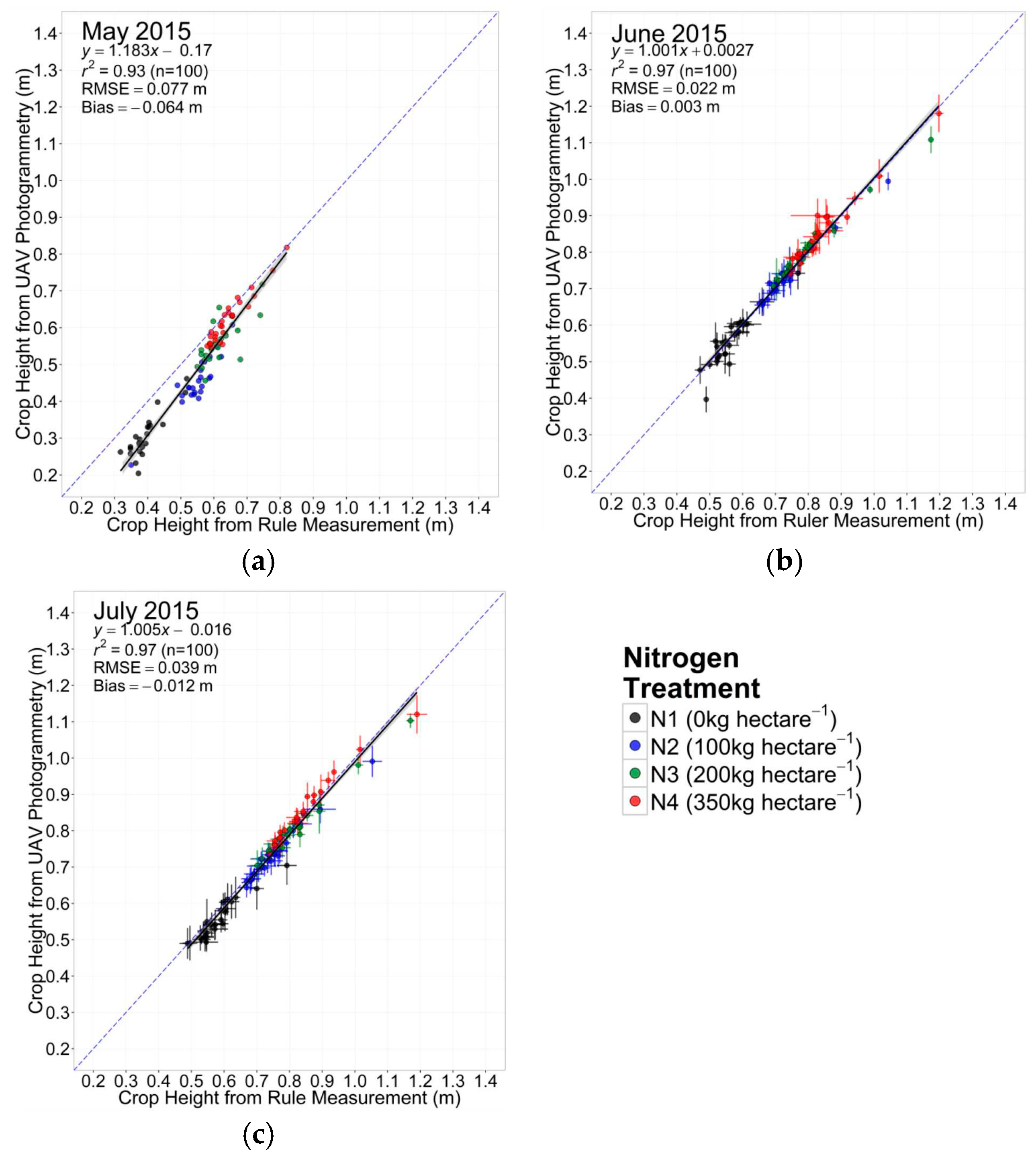29] found the inclusion of oblique imagery into a NADIR image data set can further improve 3D model accuracy. In this study, software settings were also found to be influential on accuracy of model outputs, therefore in future these should be carefully selected and accurately reported in order to facilitate further advances in UAV based SfM methods and in the accuracy of results. The use of NIR imagery instead of RGB is also an area of interest, as the increased contrast between plant and soil offered by NIR imagery may improve model processing; a potential solution to the negative influence of decreased canopy structure on model derived heights as shown by the May accuracy assessment results (