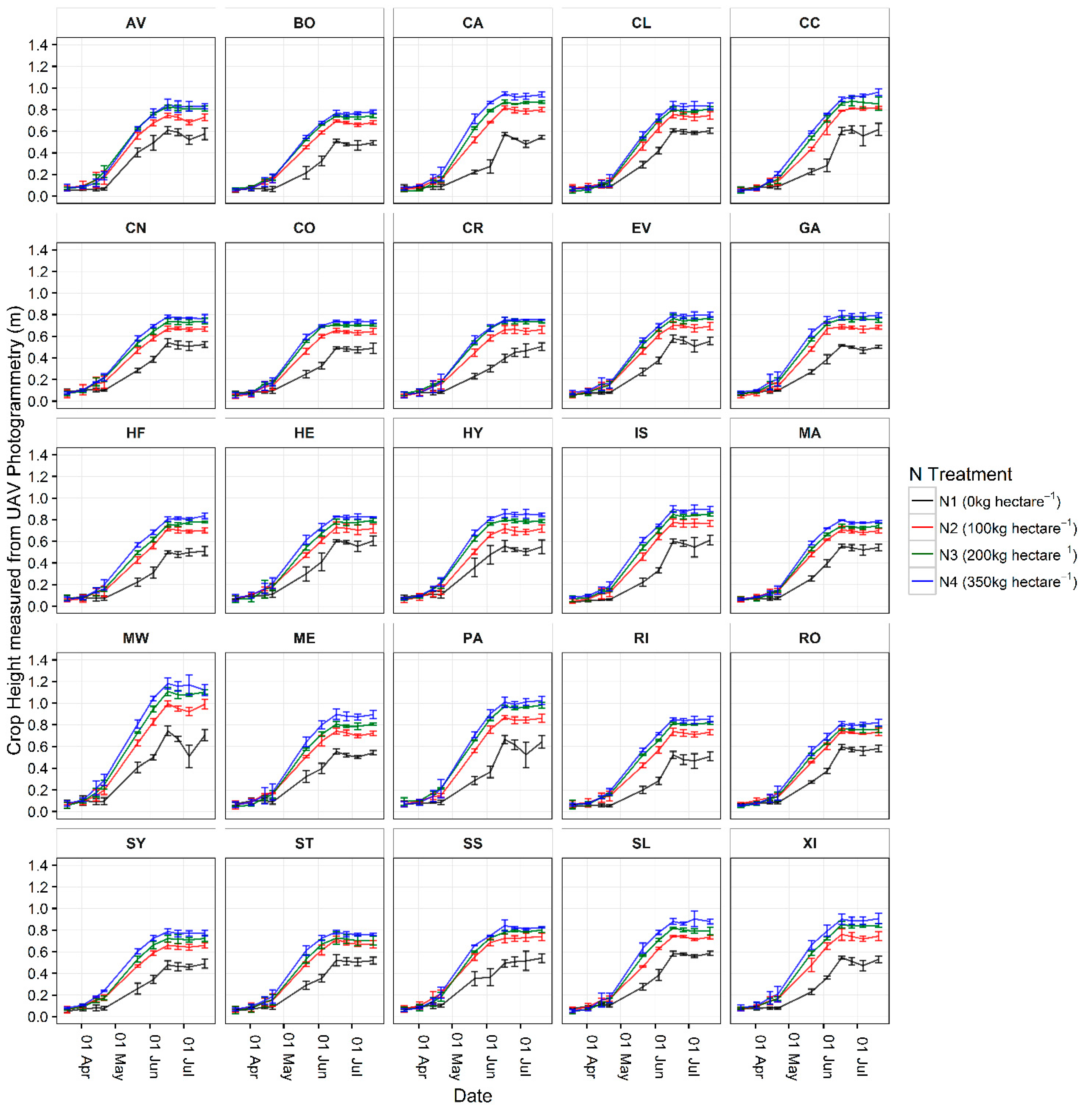 This study has provided a quantifiable assessment of Unmanned Aerial Vehicle (UAV) based Structure from Motion (SfM) Photogrammetry for deriving accurate measurements of crop height and crop growth rate, in this case to support field phenotyping efforts of 25 wheat varieties grown under four different nitrogen fertiliser treatments. The method presented is relatively straightforward, easily repeatable, and time and cost efficient in comparison to the terrestrial LiDAR and currently used rule method also investigated in this study.