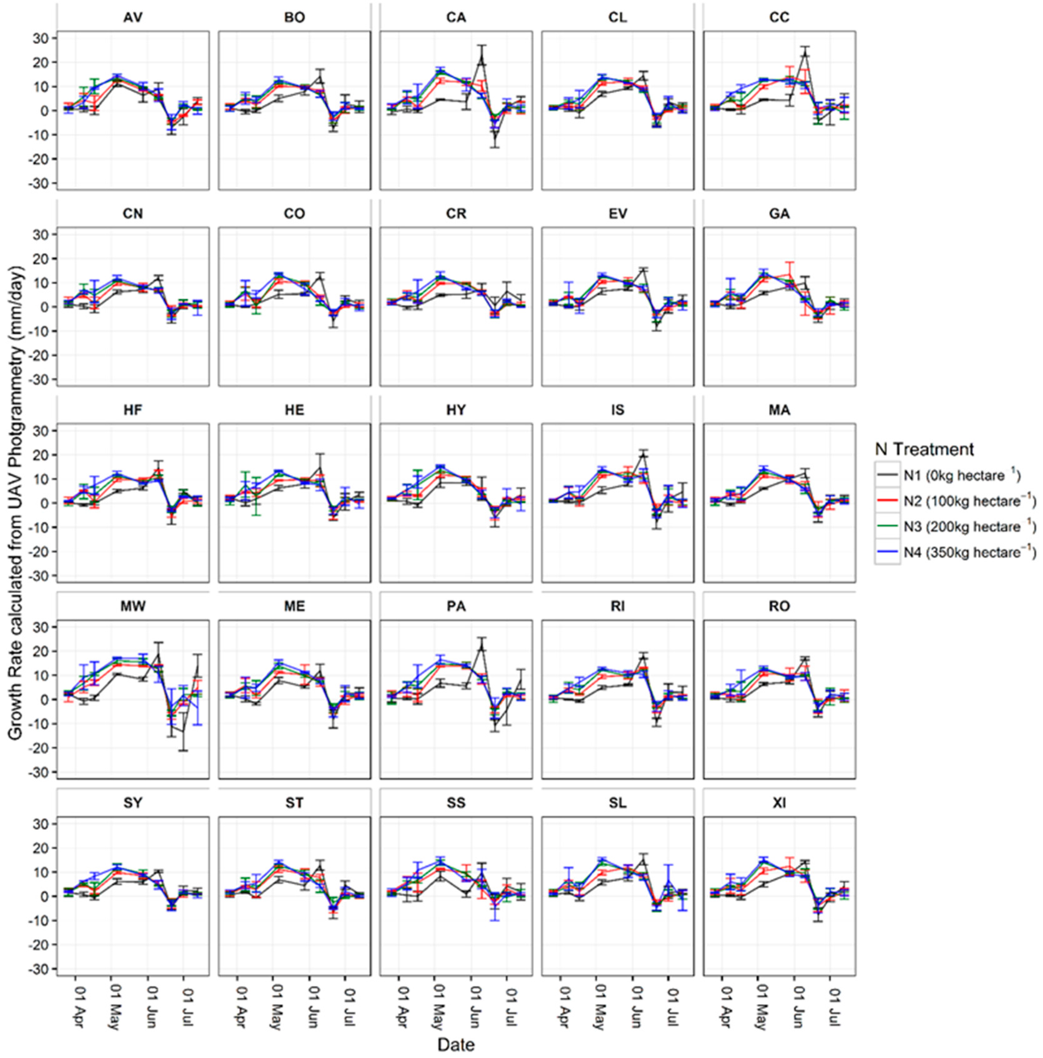 36]. The repetition of height measurements from the UAV method allowed crop growth rates to be calculated and assessed. The main results of this study were in agreement with the literature which defines the main period of UK wheat crop growth in terms of height gain between early-April and mid-June [
