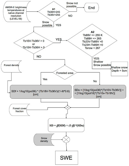 The current AMSR-E SWE operational algorithm was built on this original effort and was developed at the NASA Goddard Space Flight Center [48]. Static ancillary datasets were introduced and consisted of global forest fraction Boston University IGBP data (MOD12Q11IGBP) [49], global forest density (University of Maryland’s (UMD) Vegetation Continuous Fields (VCF) based on MOD09A1), Land, Ocean Coasts & Ice Mask (derived from Moderate Resolution Imaging Spectroradiometer (MODIS) MOD12Q1 IGBP land cover data). A snow possible/not possible mask based on snow climatology data [50] was also introduced to account for the presence/absence of snow. For reader’s convenience, the sources of ancillary data are provided in Table 2. The flowchart diagram of the AMSR-E SWE operational algorithm is reported in Figure 1.