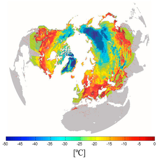 and gr36 and gr18_36 are the grain size estimated using only the 36.5 GHz brightness temperatures or both the 18.7 and 36.5 GHz values, respectively. The idea behind these coefficients is to use grain size estimates from the inversion of an electromagnetic model and account for this through the exponential function in the formula. The reason for selecting two different grain size values is to account for the different penetration depths of the microwave frequencies within the snowpack and the vertical distribution. The value of gr0 in Equations (10) and (11) was estimated as the grain size value that would correspond to the effective grain size used in the current operational algorithm when using the formula for the new coefficients, and was found to be 0.9 mm. The pfrostfact term aims at accounting for the distribution of permafrost underlying the snowpack, which impacts both the grain size metamorphism and the brightness temperatures at the lower frequencies (e.g., ~10 and ~19 GHz). The permafrost maps are obtained from [57] (updated 2001). For practical purposes, pfrostfac is set to 1 if it exceeds the value of 1. In the formula, V10 GHz_clim is the C-band vertical polarization brightness temperature climatology (2002–2009). The value of 240 K was derived from the analysis of the brightness temperatures over permafrost areas. Specifically, this value was obtained as the mean brightness temperature at 10 GHz for the months of November and December for those regions where permafrost is existing according to [57]. The value of 0.95 to obtain estimates of the permafrost temperature from the brightness temperatures at ~10 GHz was derived following Zuerndorfer et al. [58].