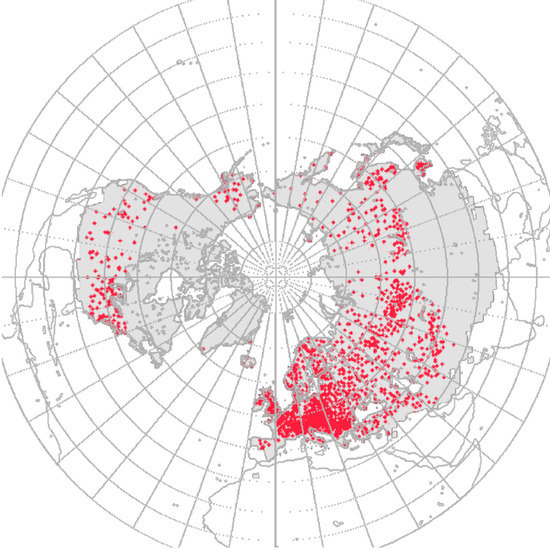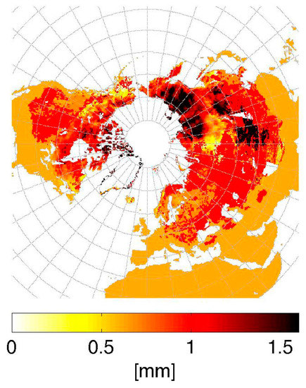 A complete description of the analysis methodology and validation is published in previous studies [62,65]. Because over most of the Arctic region there are no observations, the analysis is based on estimated snow depths from the first guess field. Moreover, snow depth observations over northern Canada might be biased to coastal locations with observing sites at open areas near airports.
