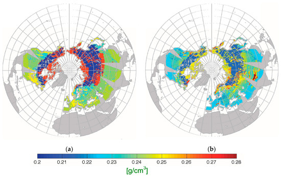 Density map (g/cm3) for 30 January 2003 used: (a) in the current AMSR-E Snow Water Equivalent (SWE) algorithm (temporally static); and (b) obtained using the approach proposed in the new algorithm.
