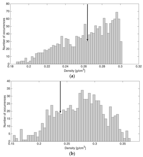 Distribution of density as computed with the new AMSR-E algorithm here proposed for all months and years for a pixel belonging to the: (a) maritime class; and (b) prairie class. Black arrows indicate the density values used in the case of the static previous algorithm.