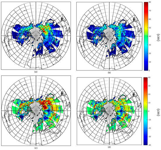 Snow depth values obtained with the: (a) original algorithm; (b) the modified algorithm; (c) the difference between the original algorithm and CMC; and (d) the modified algorithm and CMC for 1 January 2004.