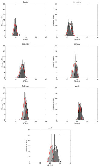 Histograms of the difference between GlobSnow and AMSR-E snow depth estimates for different months using the years between 2003 and 2011. Histograms are fitted with Gaussian distributions and the values of mean (Mu) and standard deviation (S) are reported in Table S8. Light (dark) grey bars correspond to the results obtained with the new (old) algorithm. Lines show the Gaussian distribution fitting the histograms with red (black) curve corresponding to the new (old) algorithm.