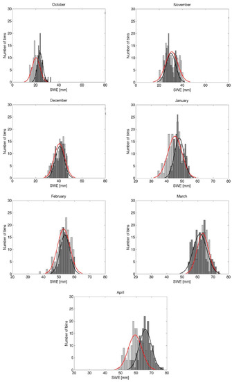 The unavailability of spatially dense measurements of SWE on ground is a limiting factor for the assessment and the evaluation of the SWE estimated from AMSR-E. When available, indeed, SWE measurements are not performed systematically or continuously over time, with those few measurements carried out at automatic stations being mainly located at high elevations, where they are not representative of the large area observed by the passive microwave sensor and where forest fraction can be very high. One way to circumvent this problem consists in comparing the outputs of the AMSR-E algorithm with other remote sensing and global snow products. This can offer a tool to understand issues and problems related to the products under consideration. As in the previous section, therefore, we compared the SWE estimated from AMSR-E from the two algorithms with SWE estimates from the GlobSnow product. As in Figure 8, Figure 9 shows the histograms of the difference between GlobSnow and AMSR-E SWE estimates obtained using the new and operational algorithms. The values of the means and standard deviations of the Gaussian distributions fitting the differences are reported in Table S9. Correlation, RMSE and bias are reported in Table 7. Similarly to snow depth, the new AMSR-E algorithm generally matches better the GlobSnow values than the operational one, with the exception of the months of November and March. One factor that needs to be accounted for when comparing SWE estimates from the different approaches is that the GlobSnow product uses a fixed density value (0.24 g/cm3) to convert snow depth estimates into SWE, whereas the operational AMSR-E algorithm uses a spatially dynamic, but temporally static density map, and the new algorithm uses a spatio-temporally dynamic map. This, obviously, makes the assessment of the comparison of the SWE values obtained with the three algorithms more difficult as it does not allow to properly understand whether the improvement (or deterioration) of one algorithm vs. another is due to snow depth or to the different use of density values used to extract SWE. In this regard, parallel activities with European and Canadian colleagues are ongoing [69].